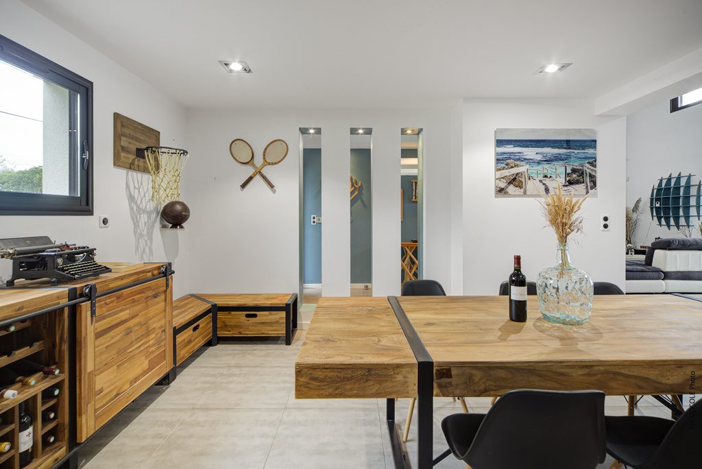 Dès l’entrée vous trouverez une pièce de vie spacieuse et baignée de lumière avec une belle hauteur sous plafond et de larges baies vitrées ouvertes sur l’extérieur.L’espace s’articule autour d’un salon chaleureux, d’une cuisine moderne entièrement équipée ouverte sur la salle à manger, idéale pour partager de beaux moments en famille ou entre amis.